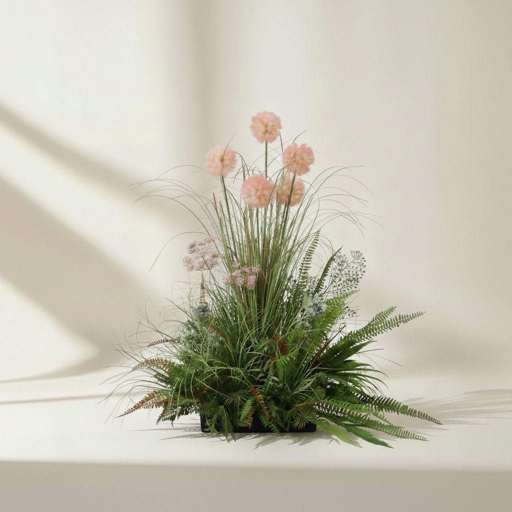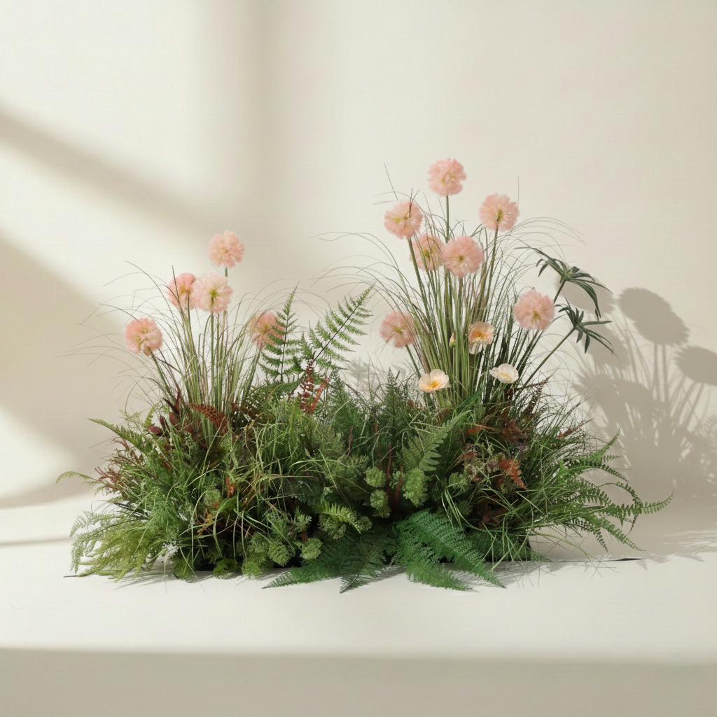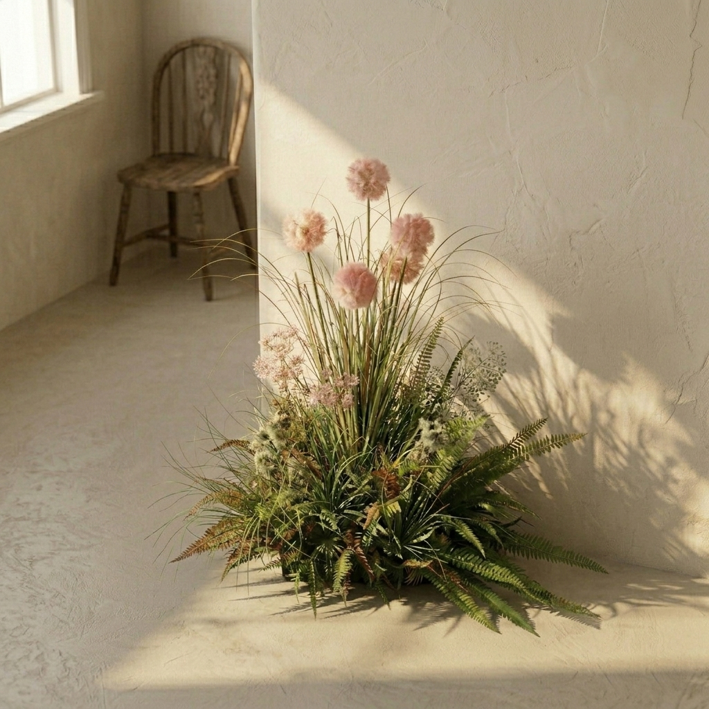 Details: Inspired by wild nature, this artificial floral arrangement takes soft pink fluffy grass as the core, paired with native ferns and fine grass, restoring the relaxed atmosphere of the wilderness flower border. No watering or maintenance required, keeping fresh all year round. It’s an ideal soft decoration for creating wabi-sabi and natural style spaces, perfect for home corners, store windows, wedding welcome areas, homestay soft decoration and more, easily creating a healing and lazy atmosphere.