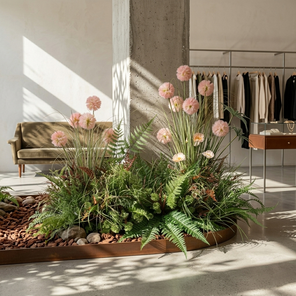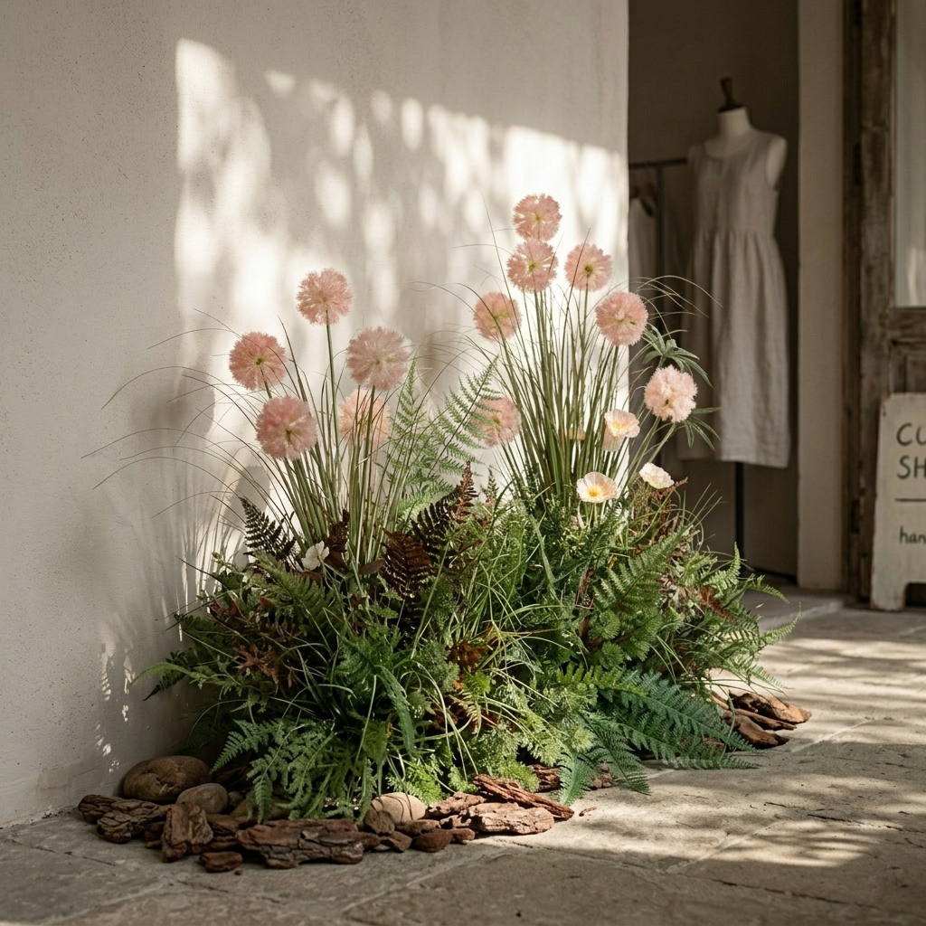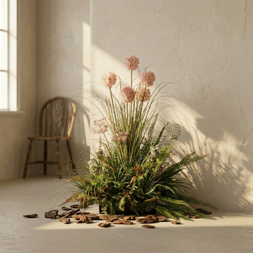 Details: Inspired by wild nature, this artificial floral arrangement takes soft pink fluffy grass as the core, paired with native ferns and fine grass, restoring the relaxed atmosphere of the wilderness flower border. No watering or maintenance required, keeping fresh all year round. It’s an ideal soft decoration for creating wabi-sabi and natural style spaces, perfect for home corners, store windows, wedding welcome areas, homestay soft decoration and more, easily creating a healing and lazy atmosphere.