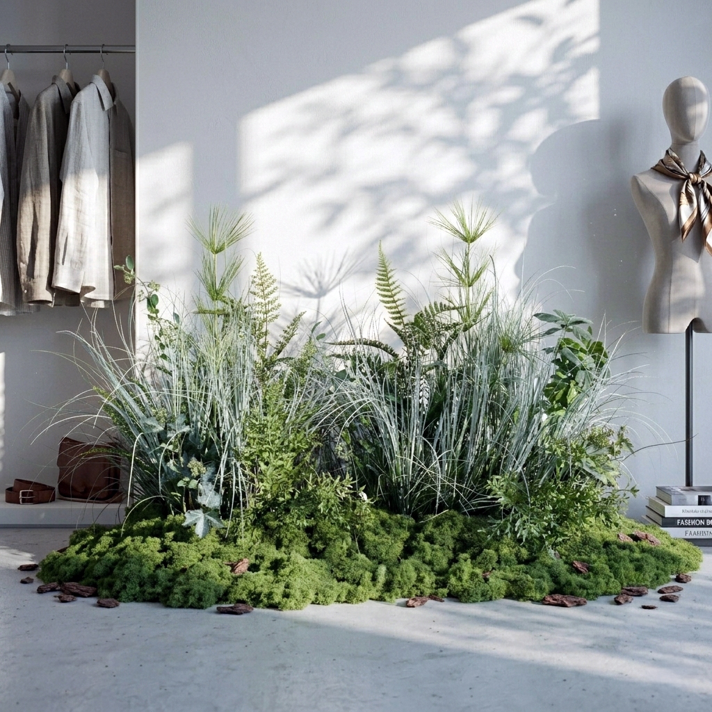 Details: Create a natural-inspired visual display with this luxury artificial greenery arrangement. Featuring layered wild grasses, delicate ferns, and a dense faux moss base, this set delivers a realistic landscape effect without maintenance. Perfect for window displays, retail visual merchandising, exhibitions, or modern interior decoration. Lightweight materials allow easy positioning and flexible styling.