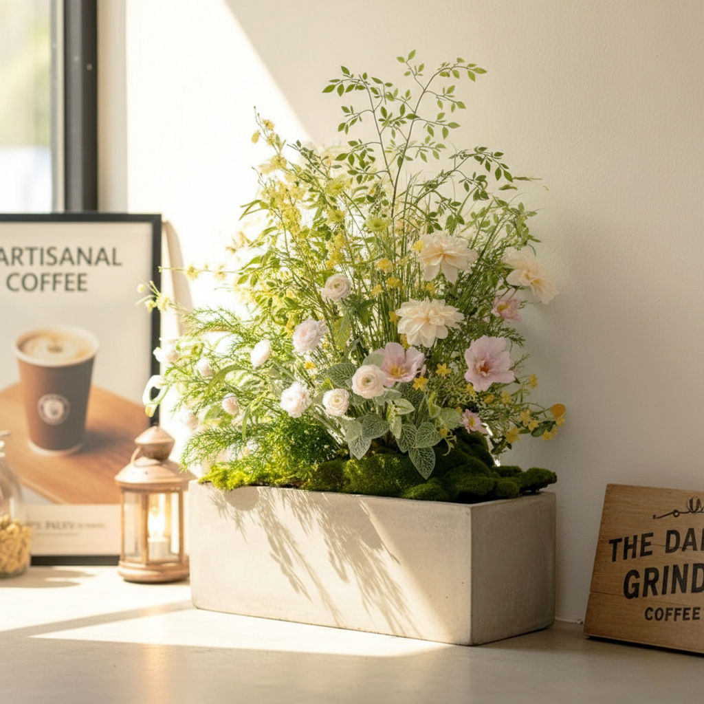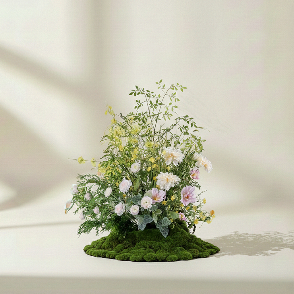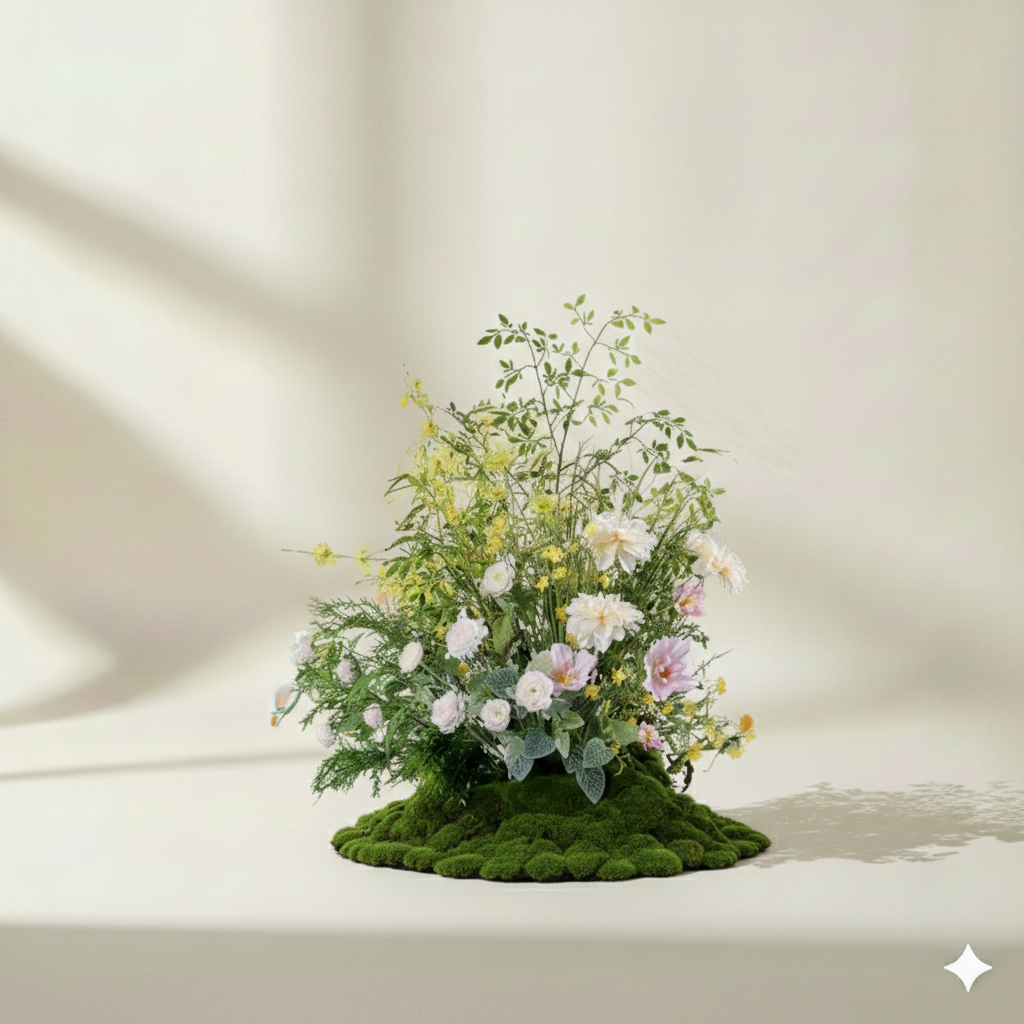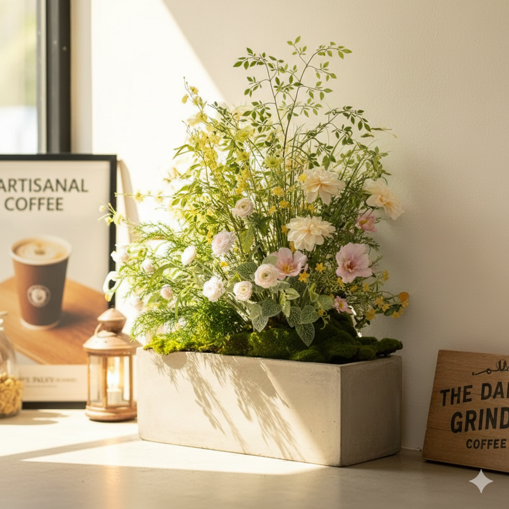 Details: A thoughtfully arranged floral display that blends lush greenery with soft pastel blooms, creating a serene, natural harmony. The delicate yellow and pink flowers subtly complement the vibrant green foliage, evoking a sense of peaceful vitality. This composition is inspired by the gentle calm of early mornings, where the soft light meets the freshness of nature. Designed to feel both organic and refined, this arrangement radiates a tranquil elegance, perfect for any contemporary space seeking a touch of natural beauty and quiet sophistication.