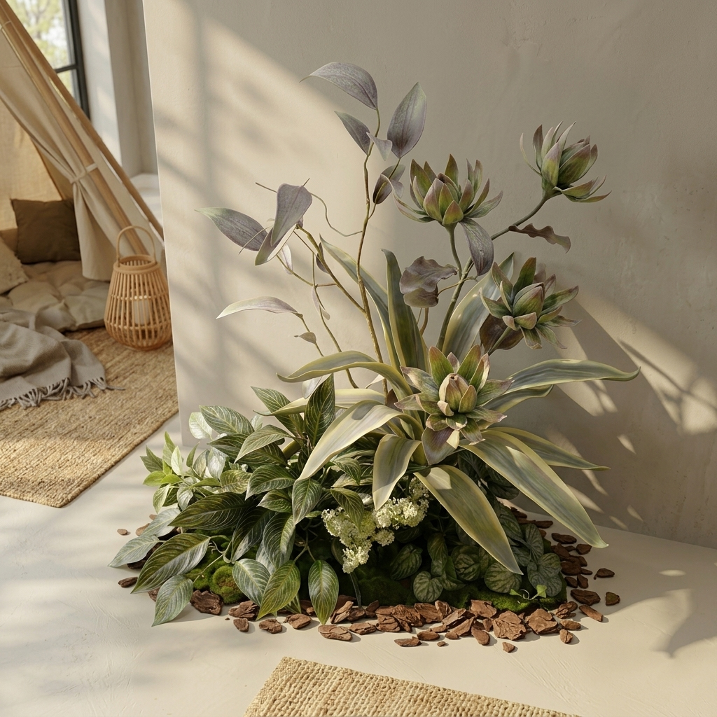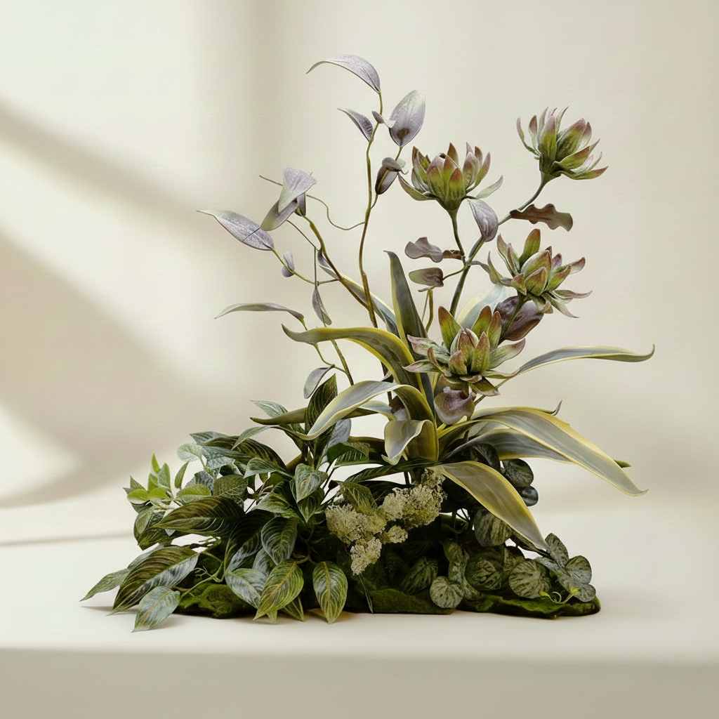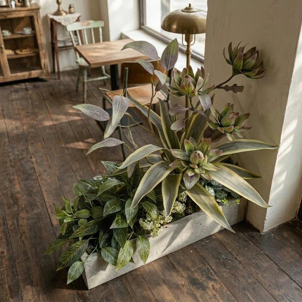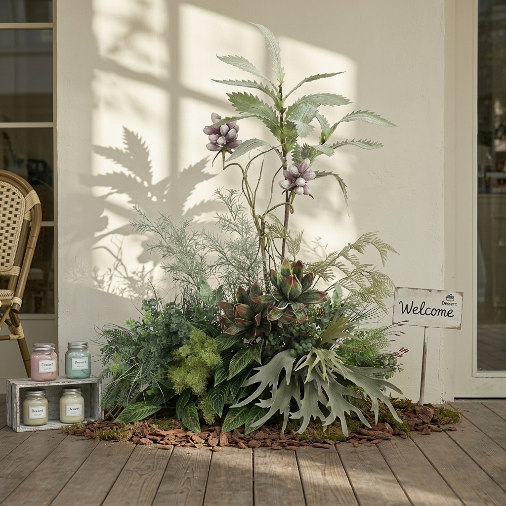 Details: Inspired by the quiet beauty of nature, this artificial plant arrangement reflects the essence of Wabi-Sabi design. The layered leaves, soft green tones, and organic structure create a calm and elegant atmosphere for any interior space.
